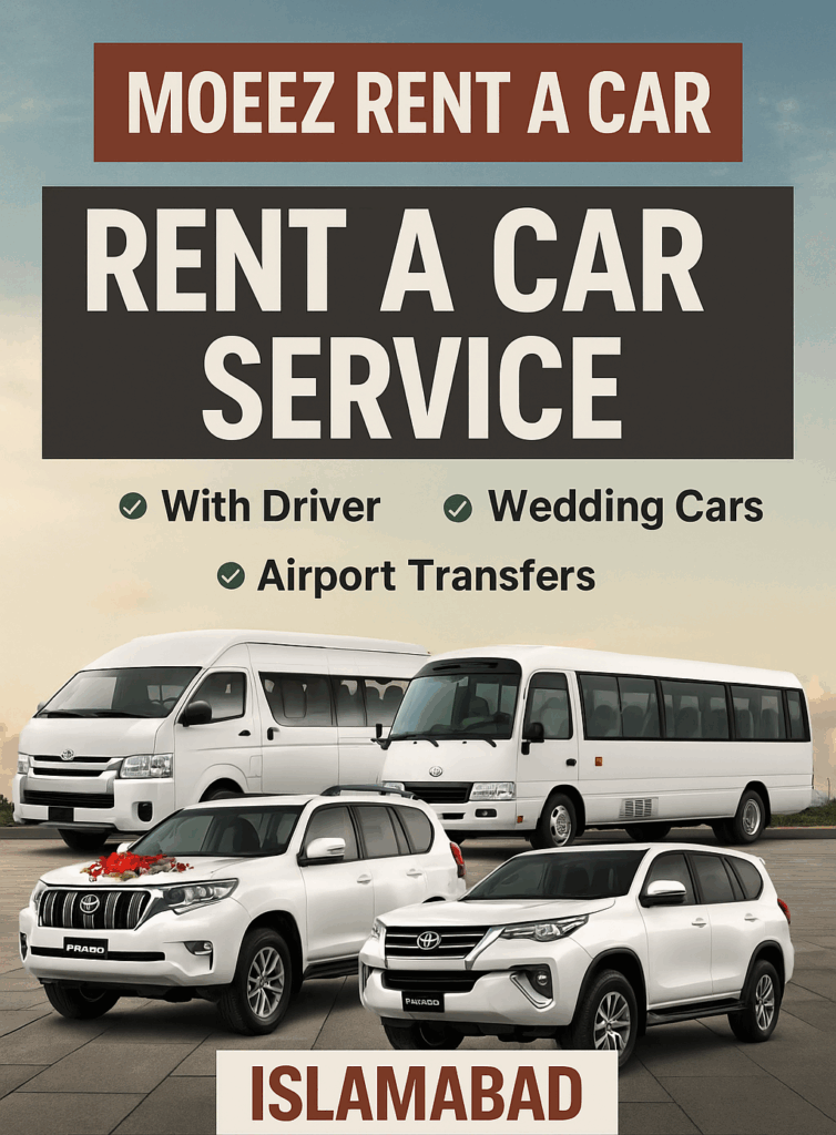 Looking for a trusted and affordable rent a car service in Islamabad? Book now with MoeezRentACar.com – your reliable car rental partner for local and long-distance travel across Pakistan.